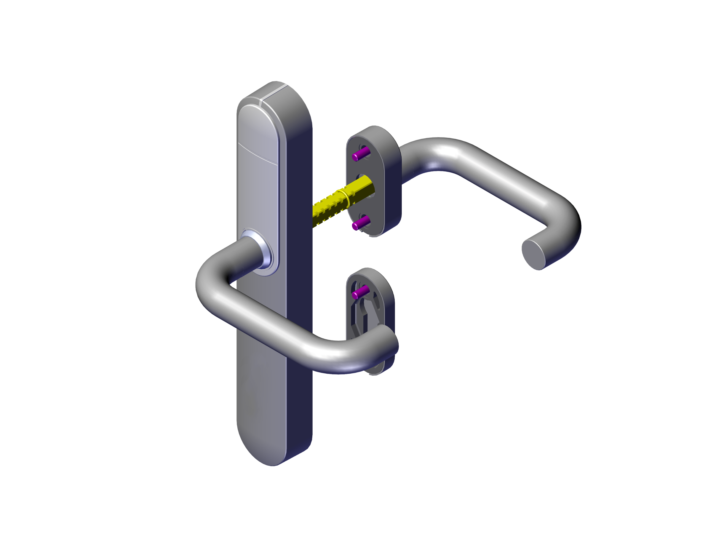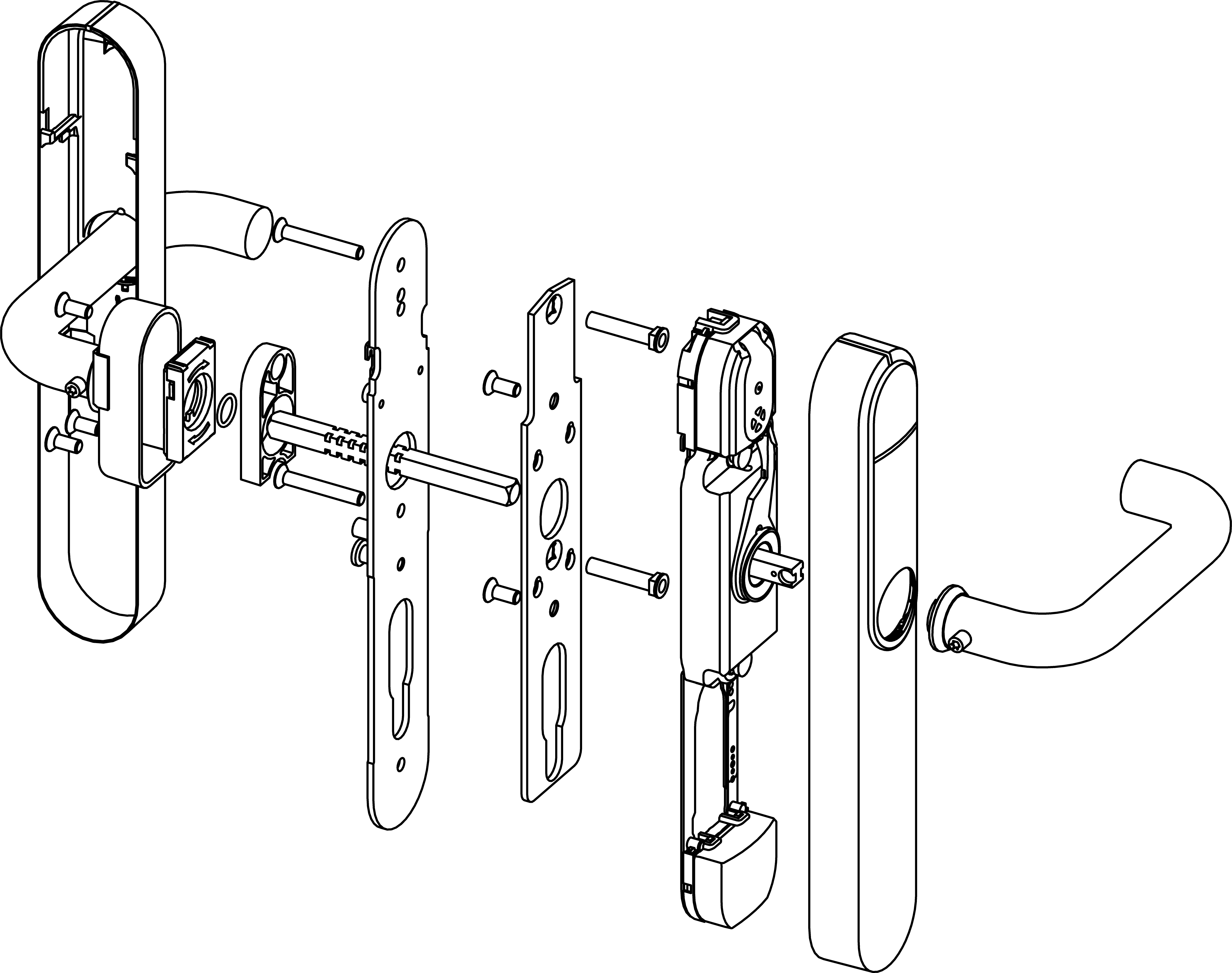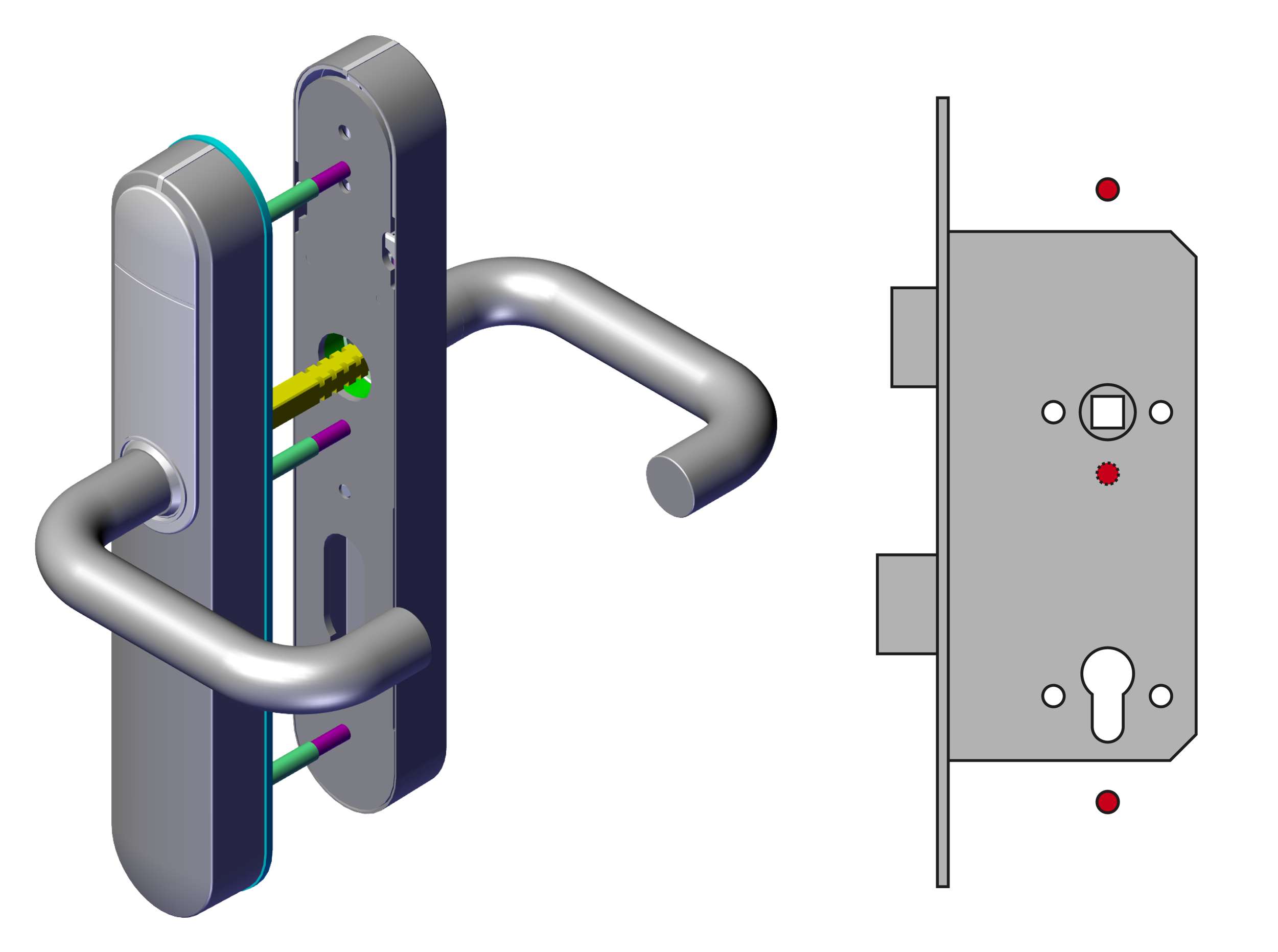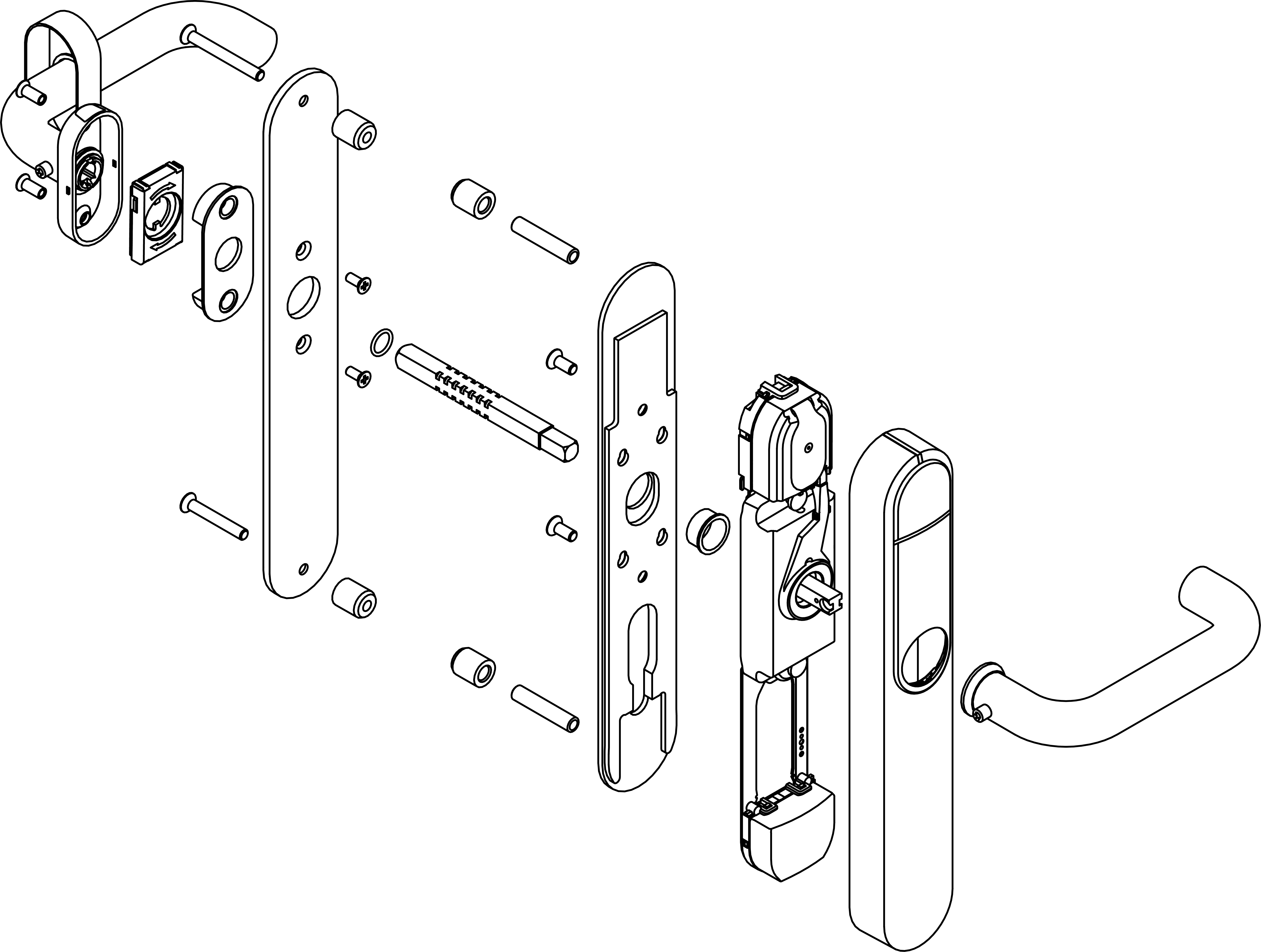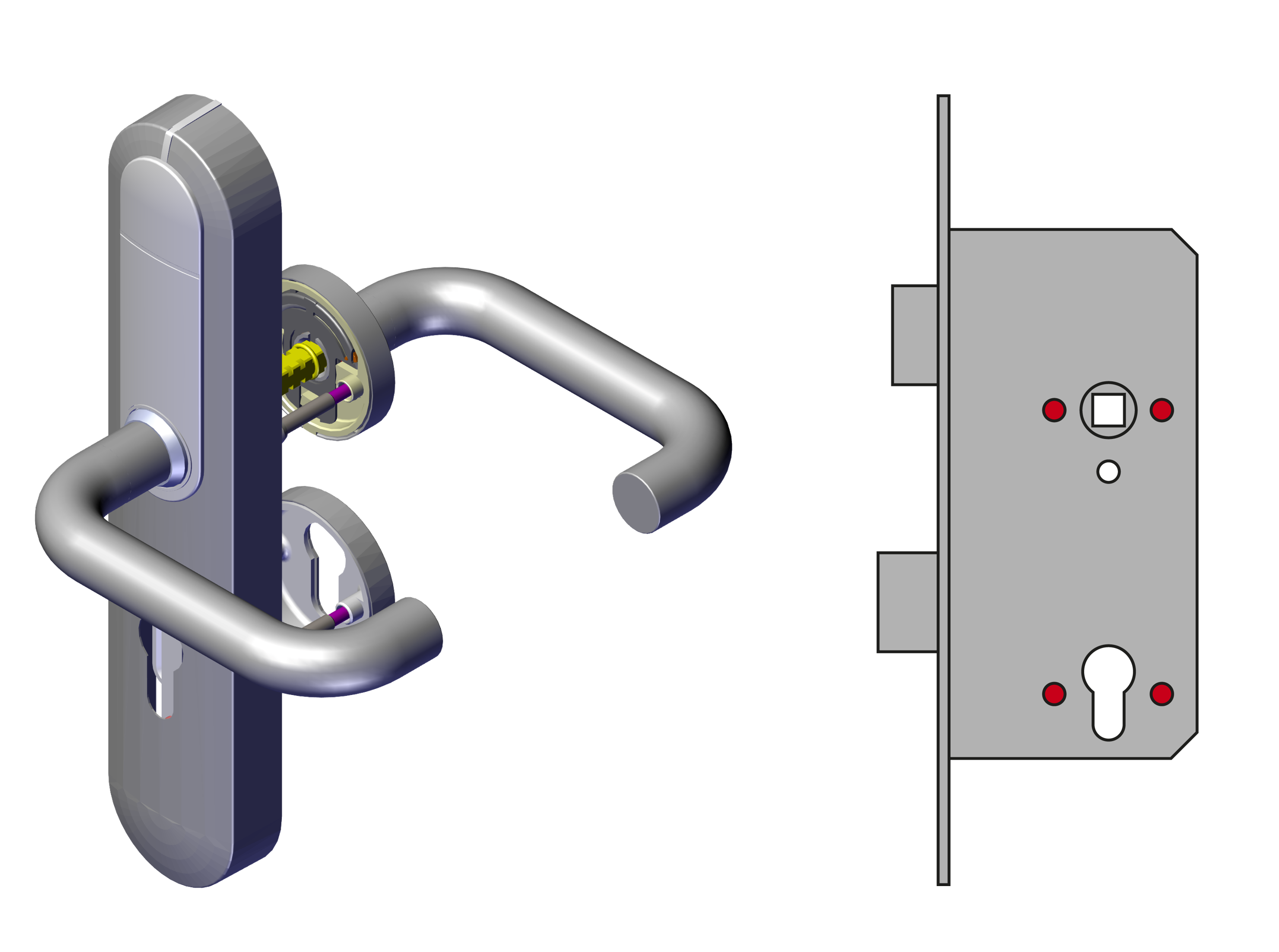 - Innen- und Außenseite werden auf der Tür verschraubt, nicht durch die Tür (Anwendungsfall Rohrrahmentüren)