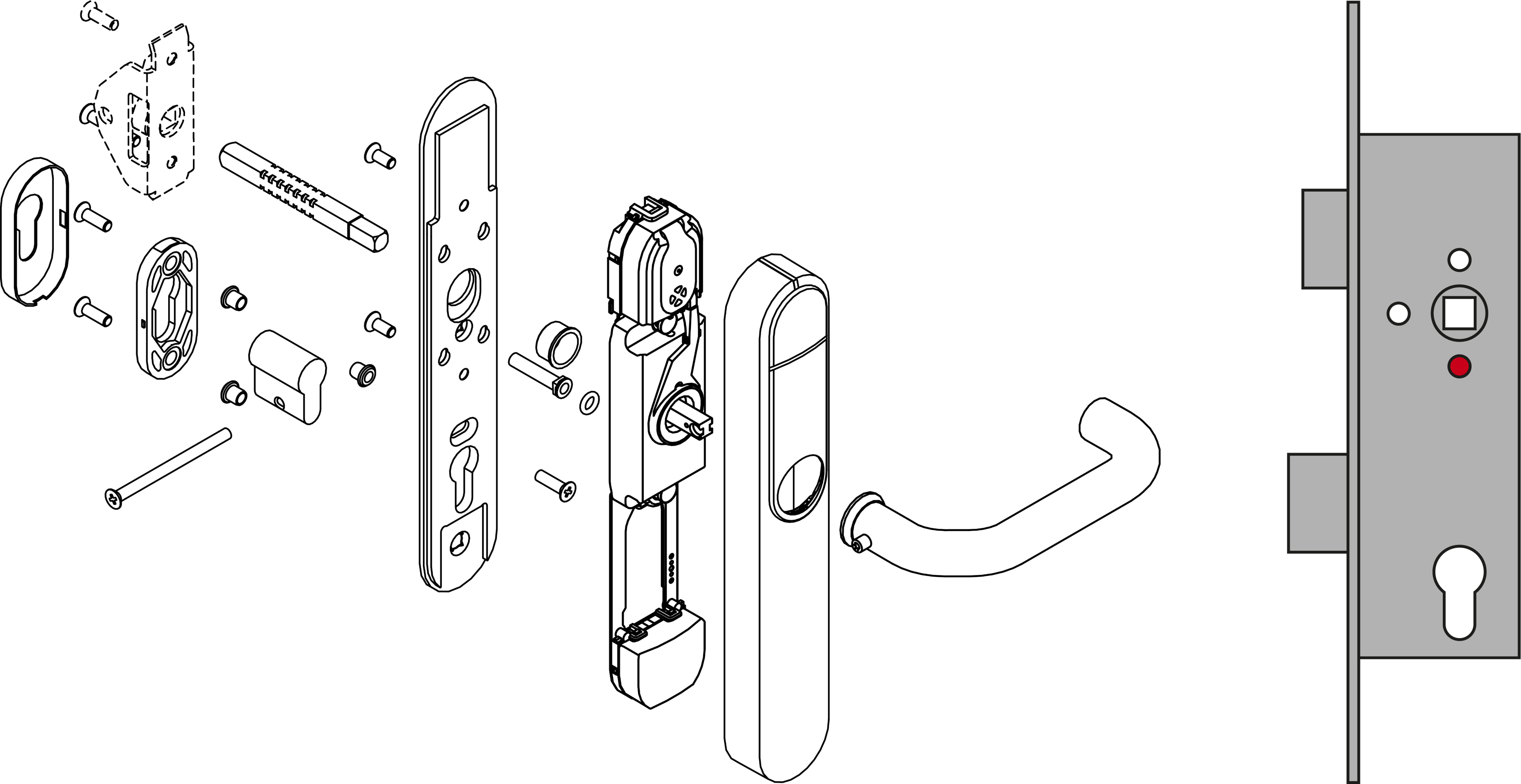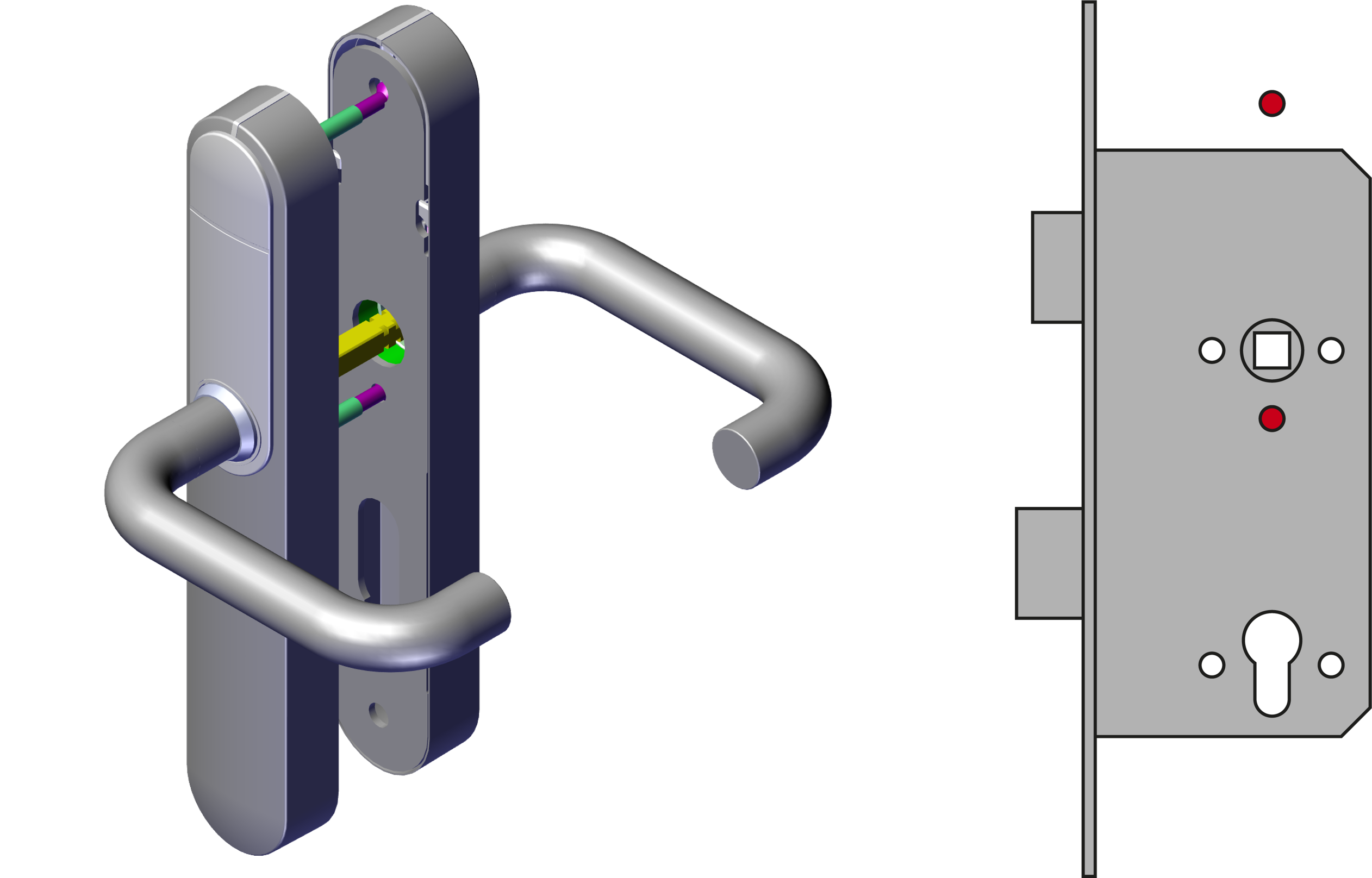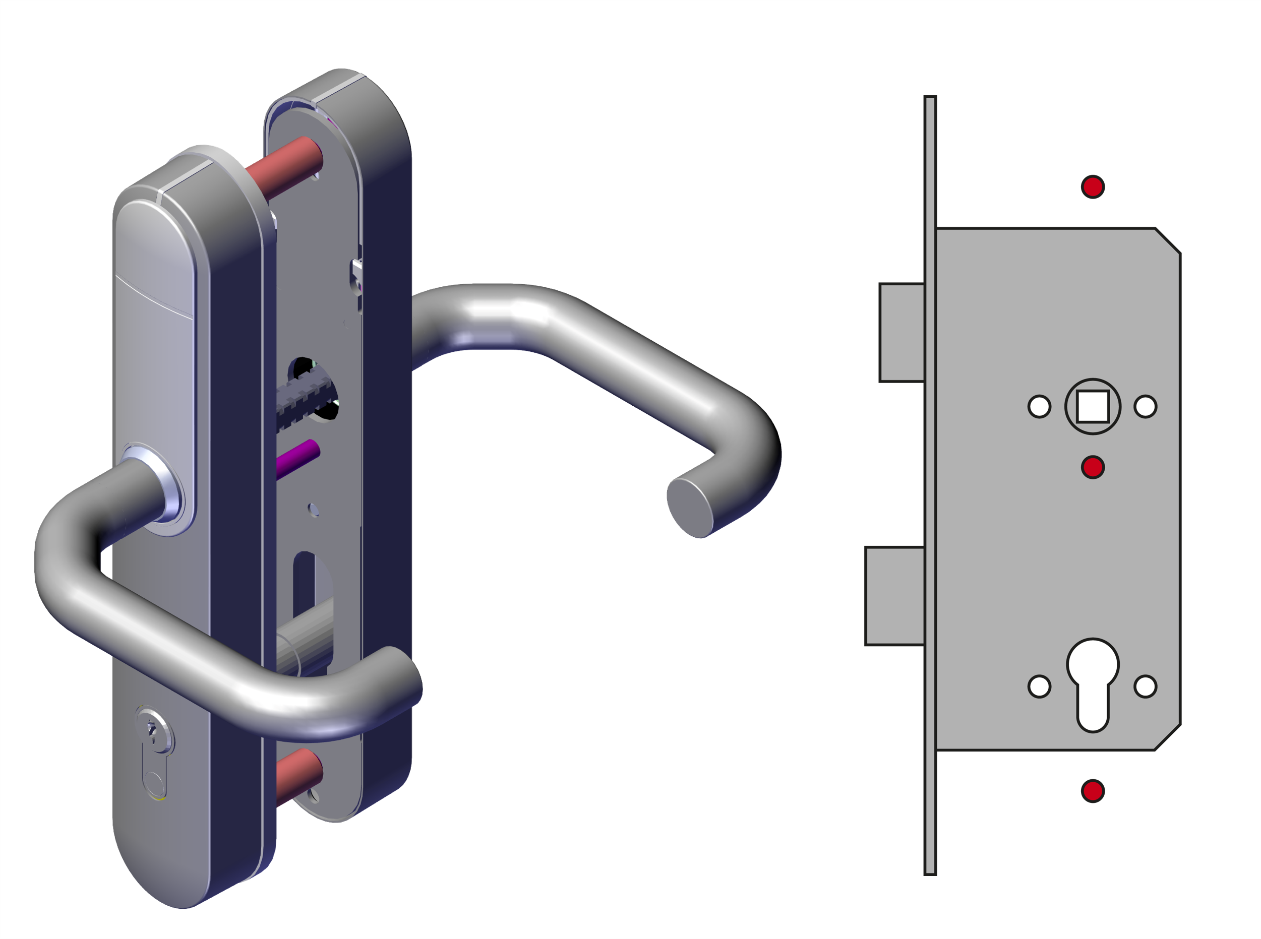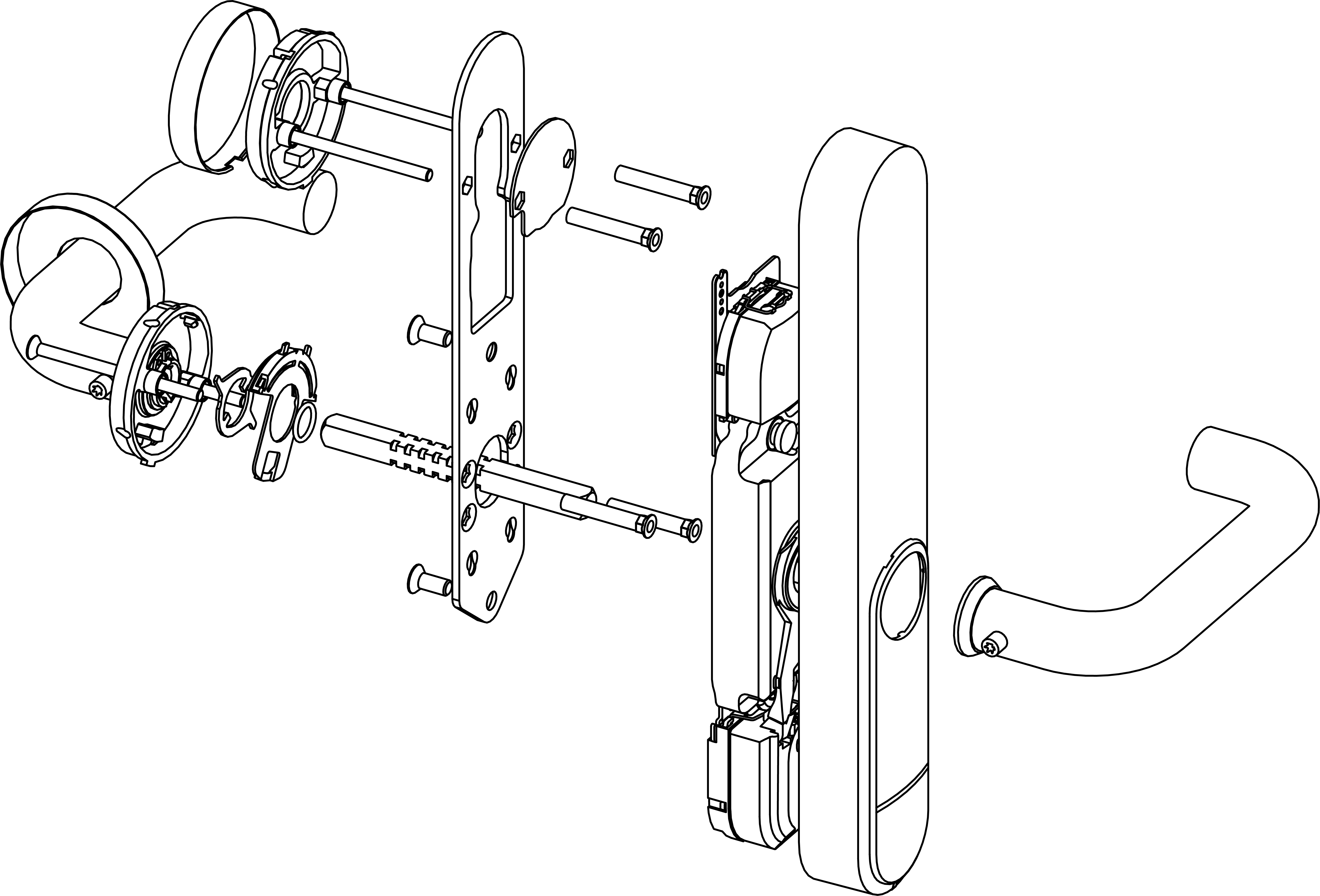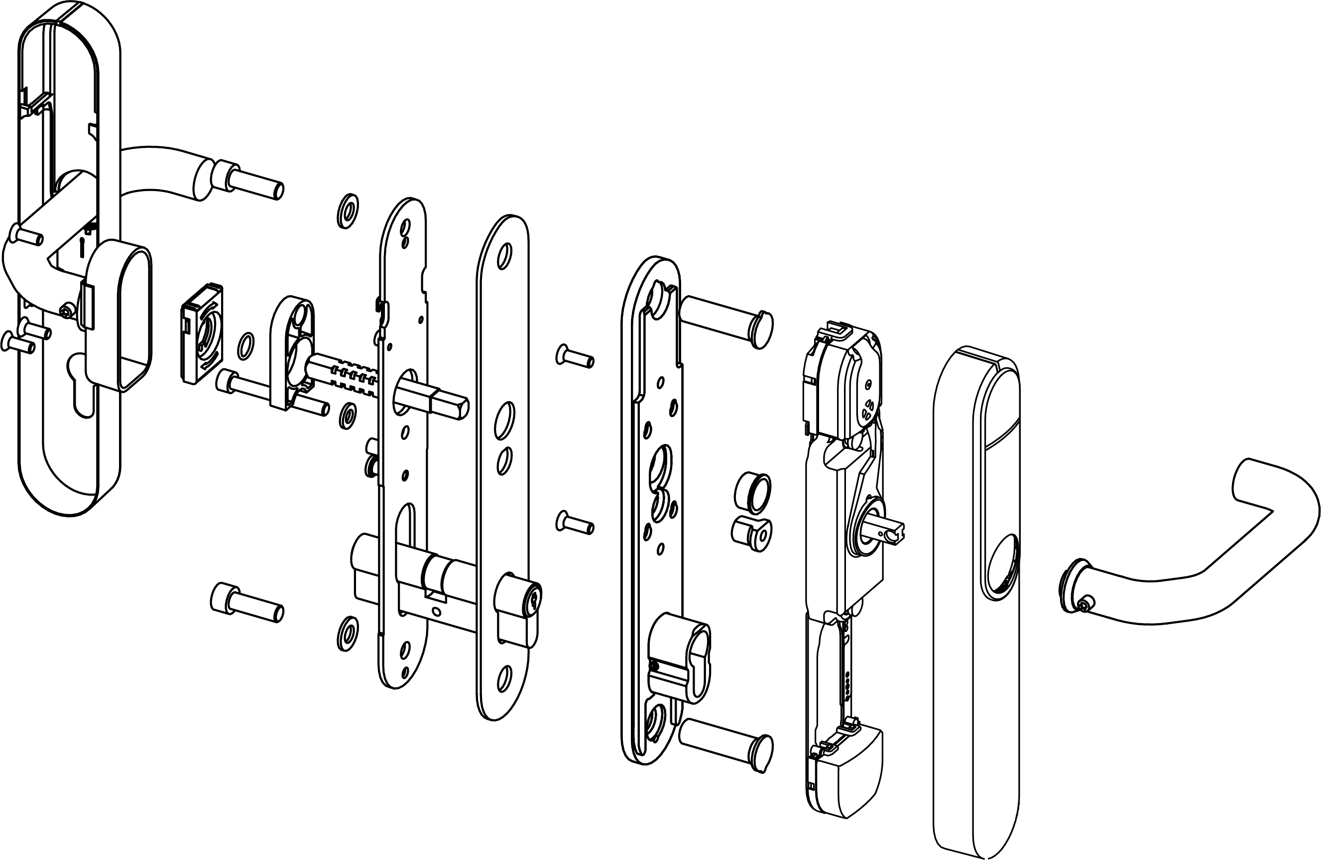 - Innen- und Außenseite werden auf der Tür verschraubt, nicht durch die Tür (Anwendungsfall Rohrrahmentüren)