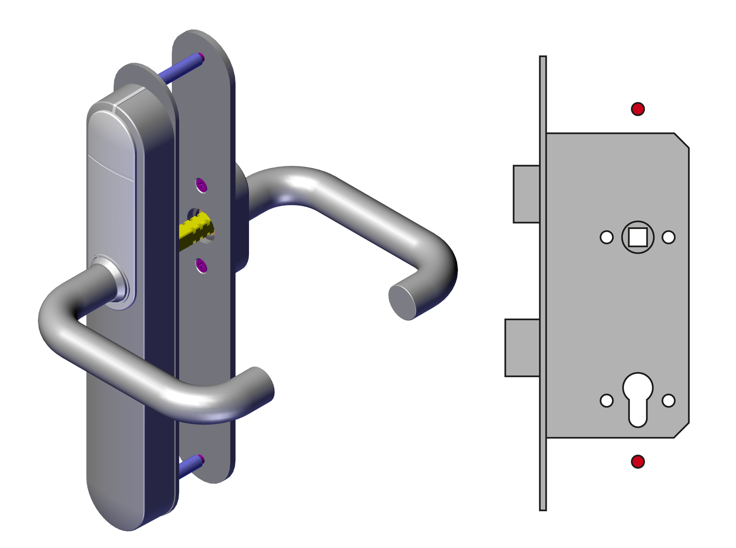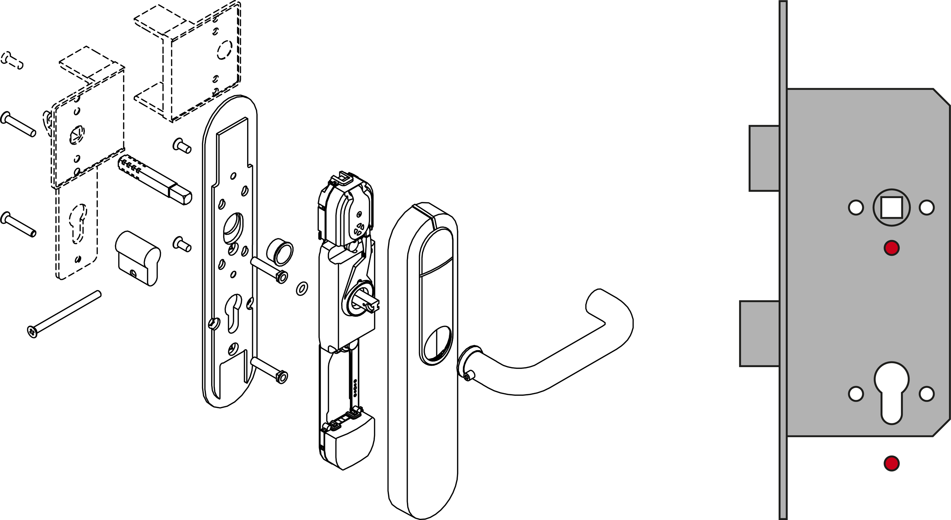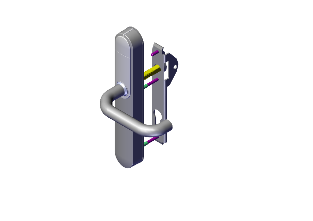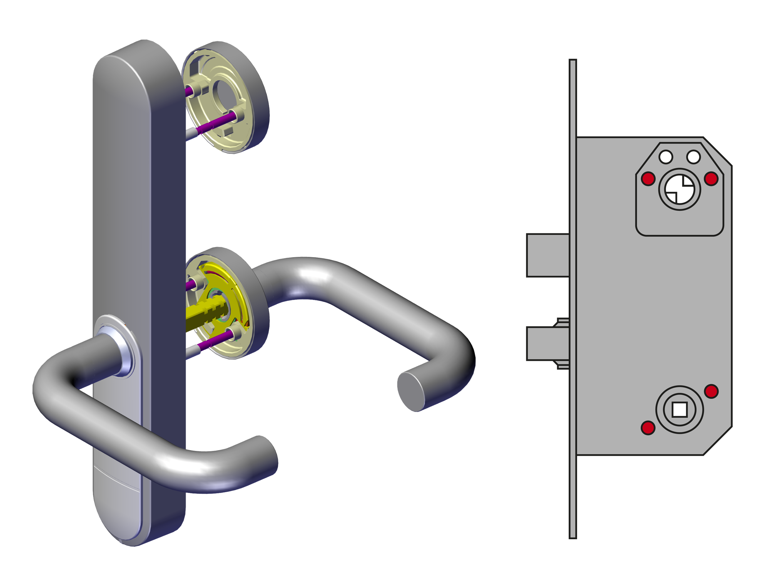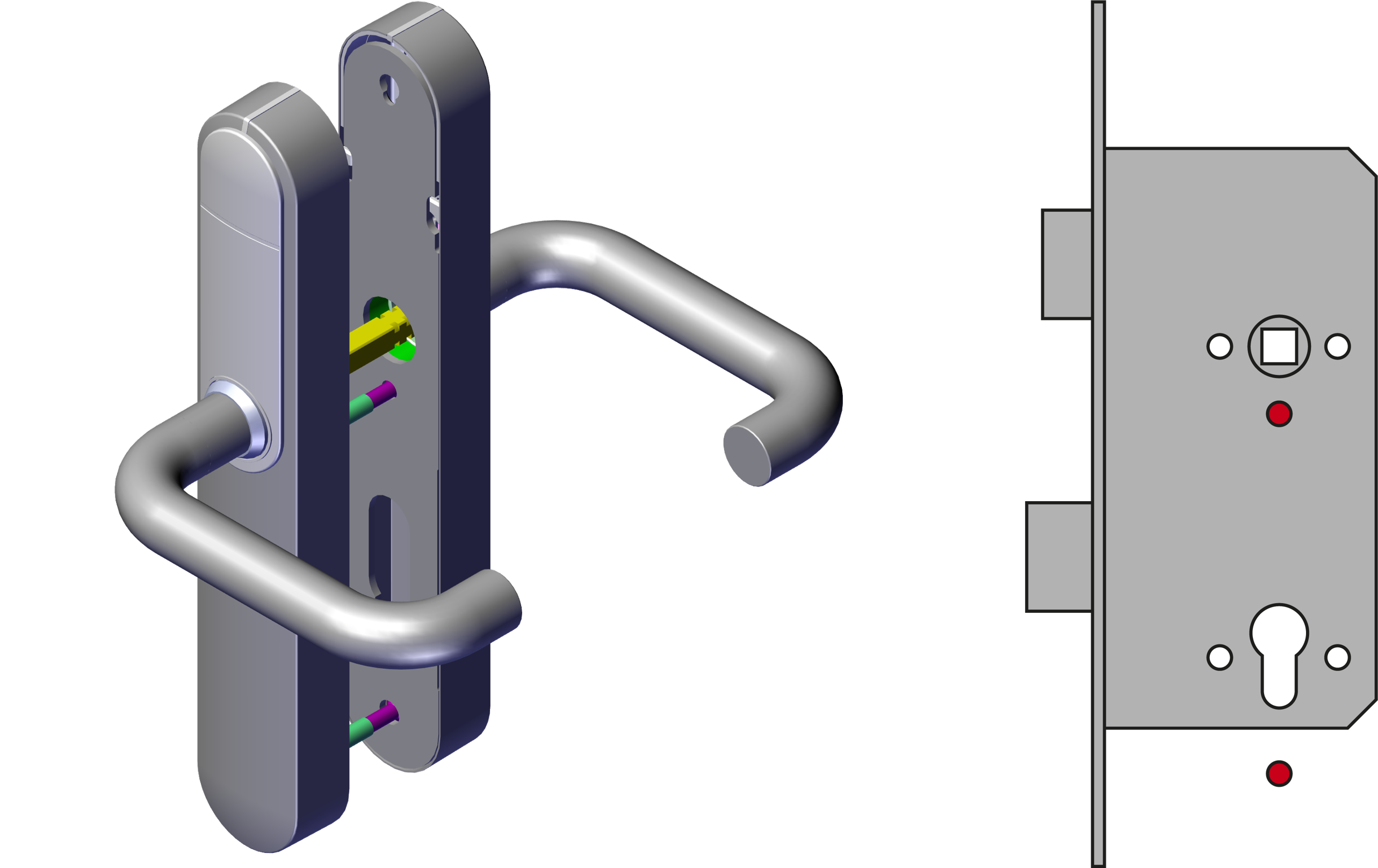 - Innen- und Außenseite werden auf der Tür verschraubt, nicht durch die Tür (Anwendungsfall Rohrrahmentüren)