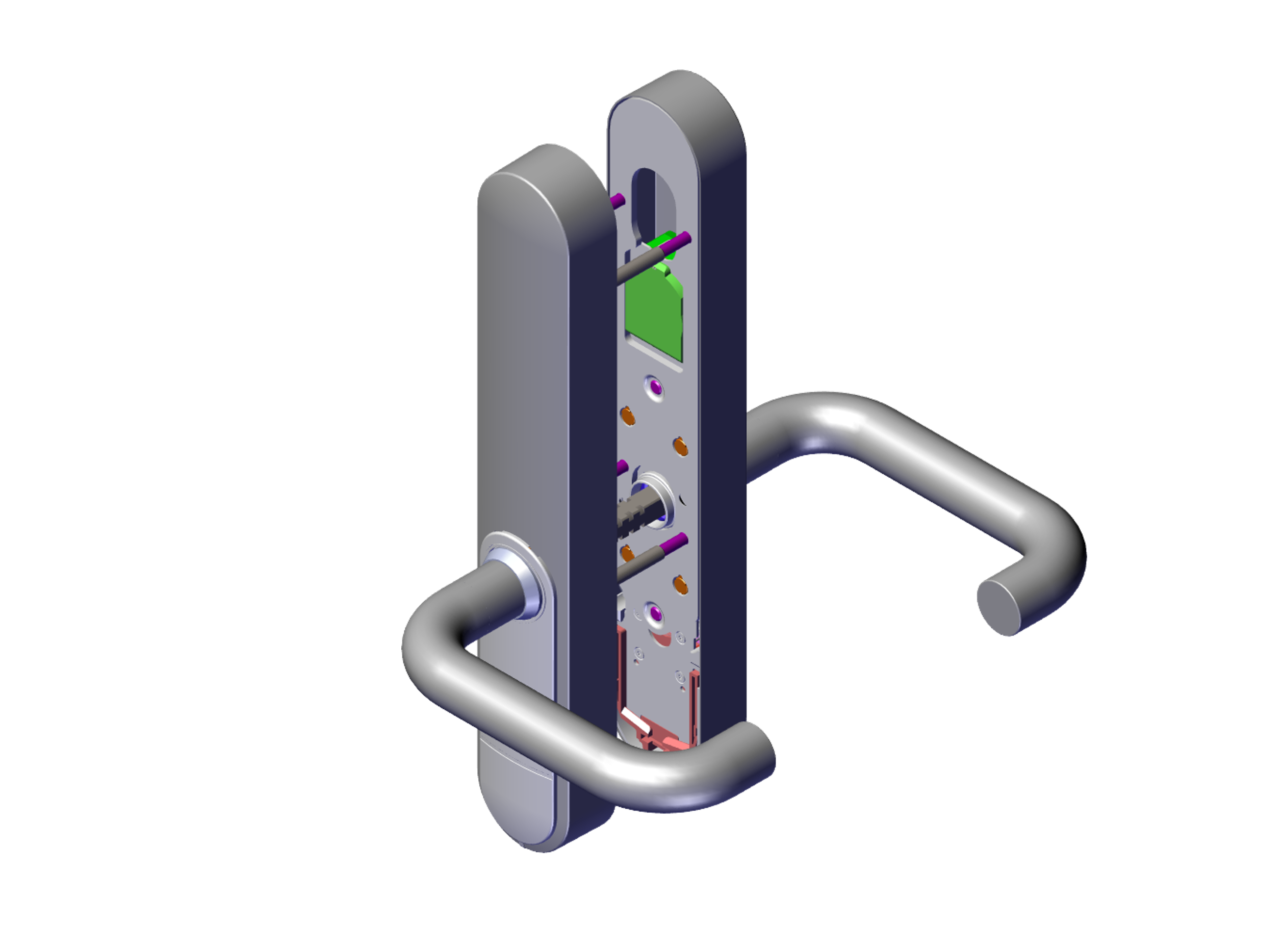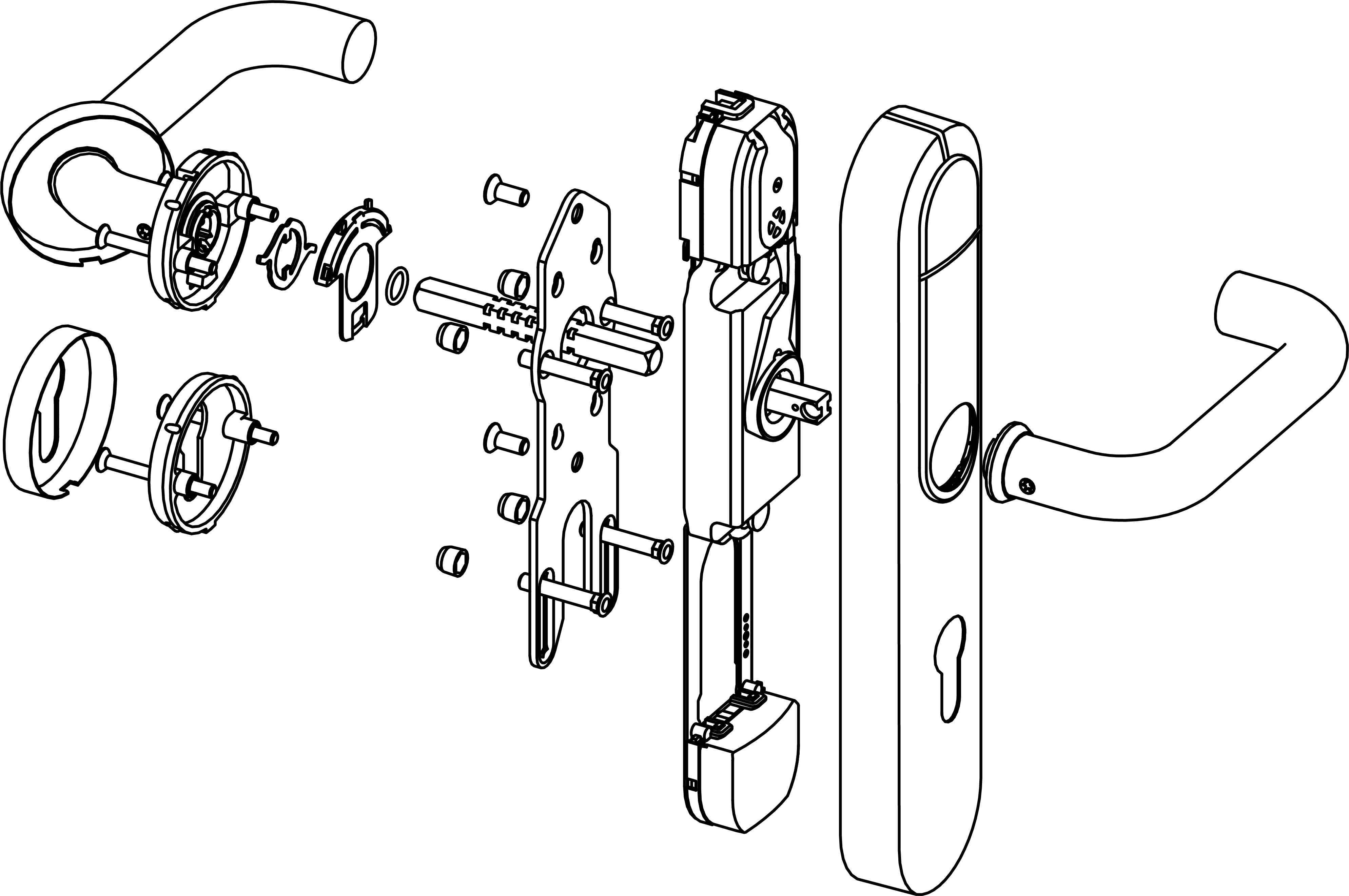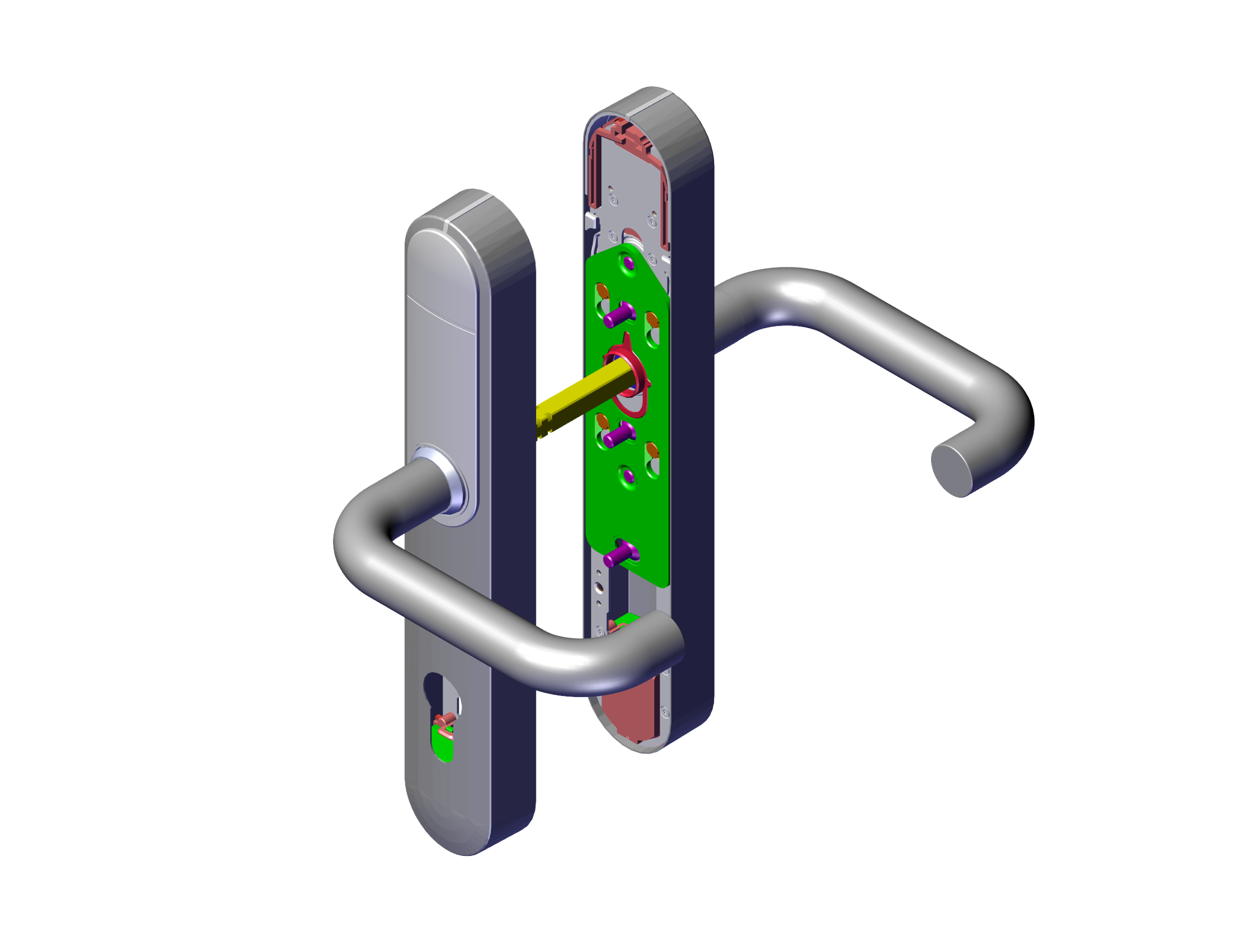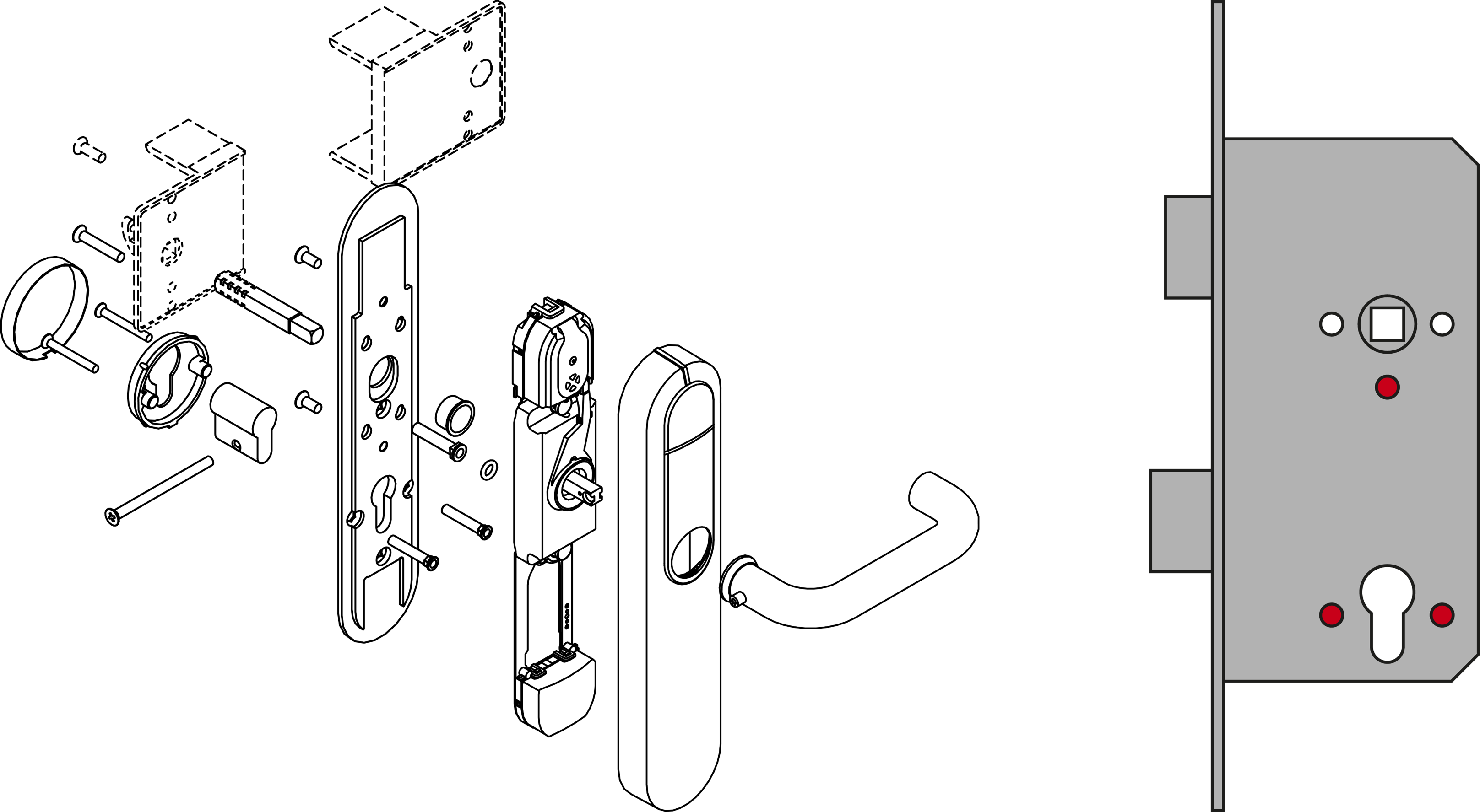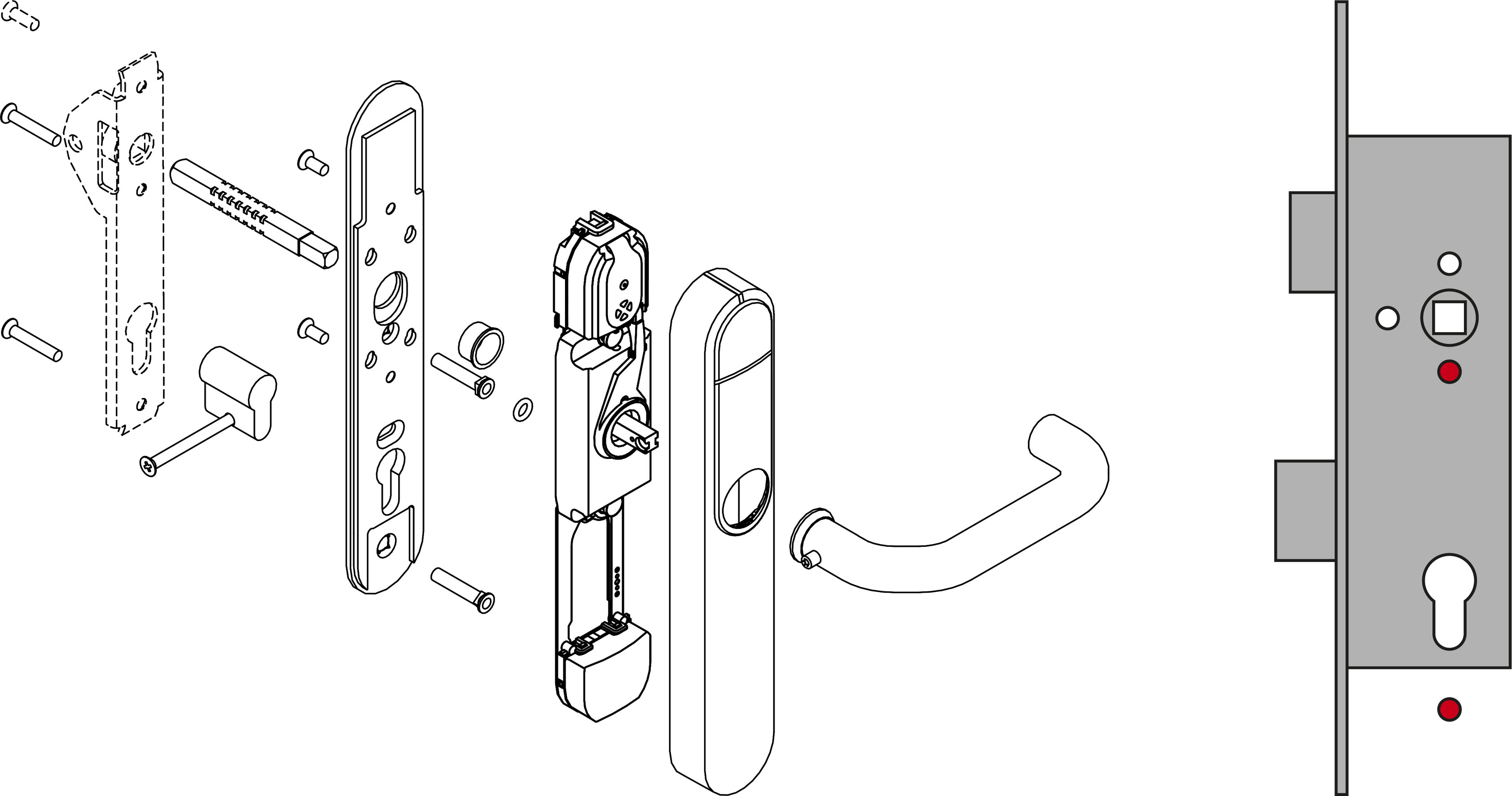 - Innen- und Außenseite werden auf der Tür verschraubt, nicht durch die Tür (Anwendungsfall Rohrrahmentüren)