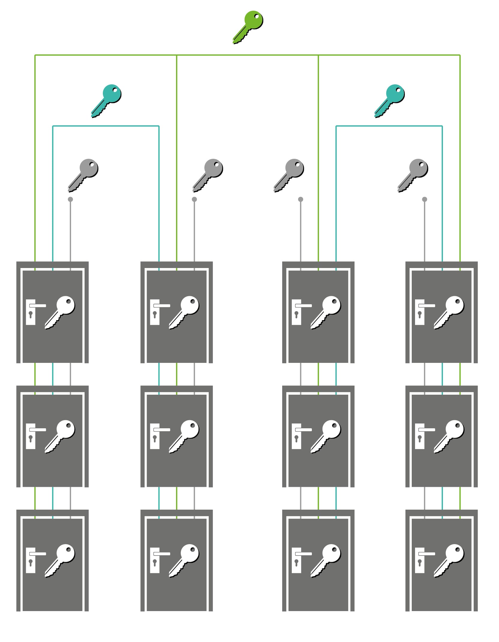 Hvis man tænker på større huse eller bygningskomplekser, vil man kunne tænke sig frem til, at et nøglebundt ville blive ret stort, hvis der skulle bruges en separat nøgle til hver dør. For eksempel i en virksomhed: Hovedindgang, eget kontor, materialelager, konferencerum... I dette scenario ville du allerede have fire forskellige nøgler. Alle, der har adgang til de samme rum, får så også fire nøgler. Ud over ens eget konstant voksende nøglebundt bliver det derfor hurtigt svært at holde styr på den samlede situation, når det gælder tildelingen af låsetilladelser.