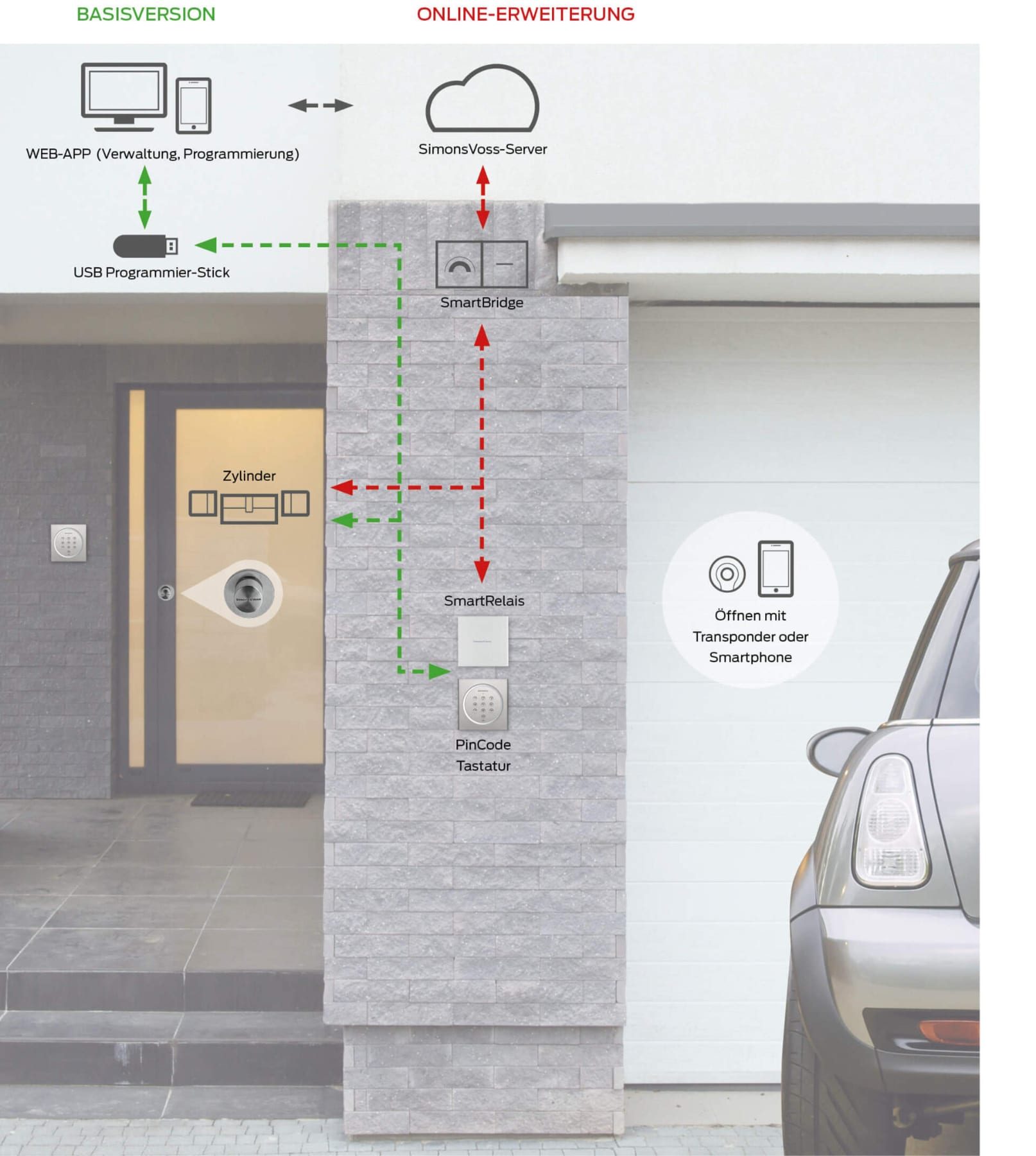 MobileKey erstatter den mekaniske nøkkelen med en digital transponder, et PIN-kodetastatur eller smarttelefonen din. Du kan bruke digitale låssylindere i stedet for mekaniske. Uten kabler og uten å bore. Konfigurer systemet ved hjelp av en gratis webapp - og ditt skreddersydde låssystem er klart. Det brukervennlige elektroniske systemet egner seg for boligblokker, private husholdninger og mindre næringsbygg med opptil 20 dører.